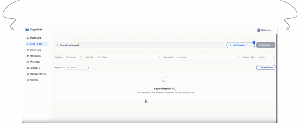 Begin your campaign by entering specific details about your products or services into CogniMail’s intuitive “Find Your Buyer” tool. This initial step is crucial as it sets the foundation for how the platform will analyze and identify potential customers who are most likely to respond positively to your outreach. This feature simplifies the process of defining your target market by filtering through extensive data to connect you with the best matches.